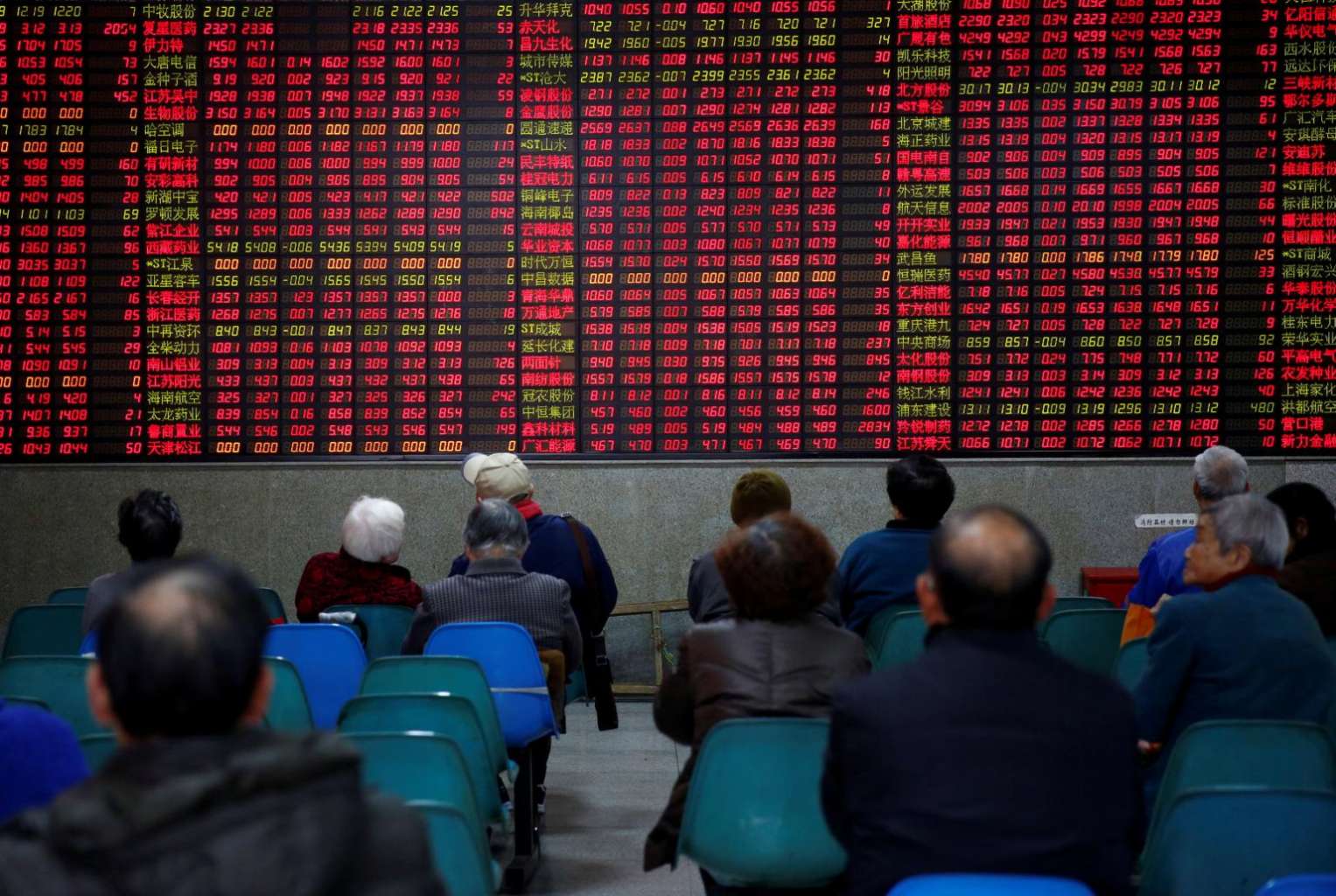 Investors look at an electronic board showing stock information on the first trading day after the New Year holiday at a brokerage house in Shanghai.