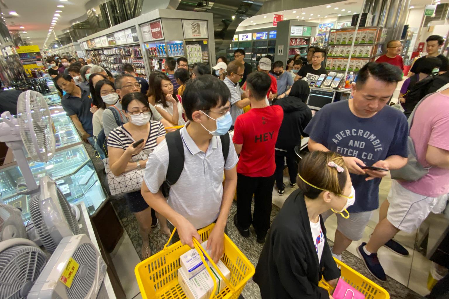 More than a hundred customers queue to buy masks at Mustafa store on Jan 28, 2020.