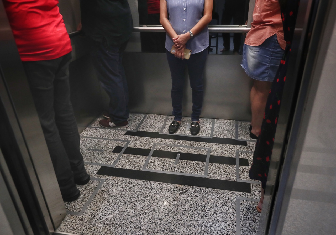 Office workers practising social distancing in the lift at Maybank Tower, on March 20, 2020.