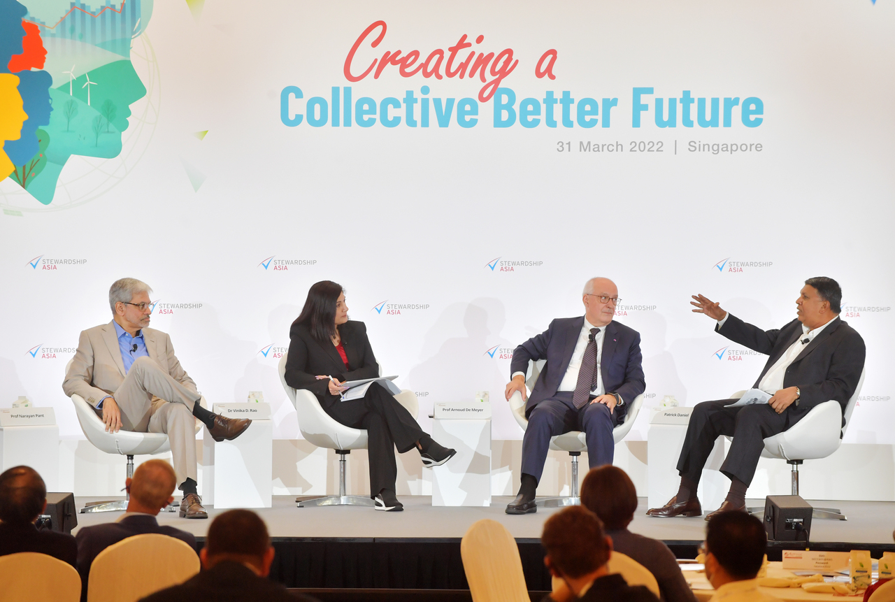 SPH Media Trust former interim CEO Patrick Daniel (at right) speaking at yesterday's Stewardship Asia Roundtable 2022 with (from left) Professor Narayan Pant, moderator Vinika D. Rao, and Professor Arnoud De Meyer.