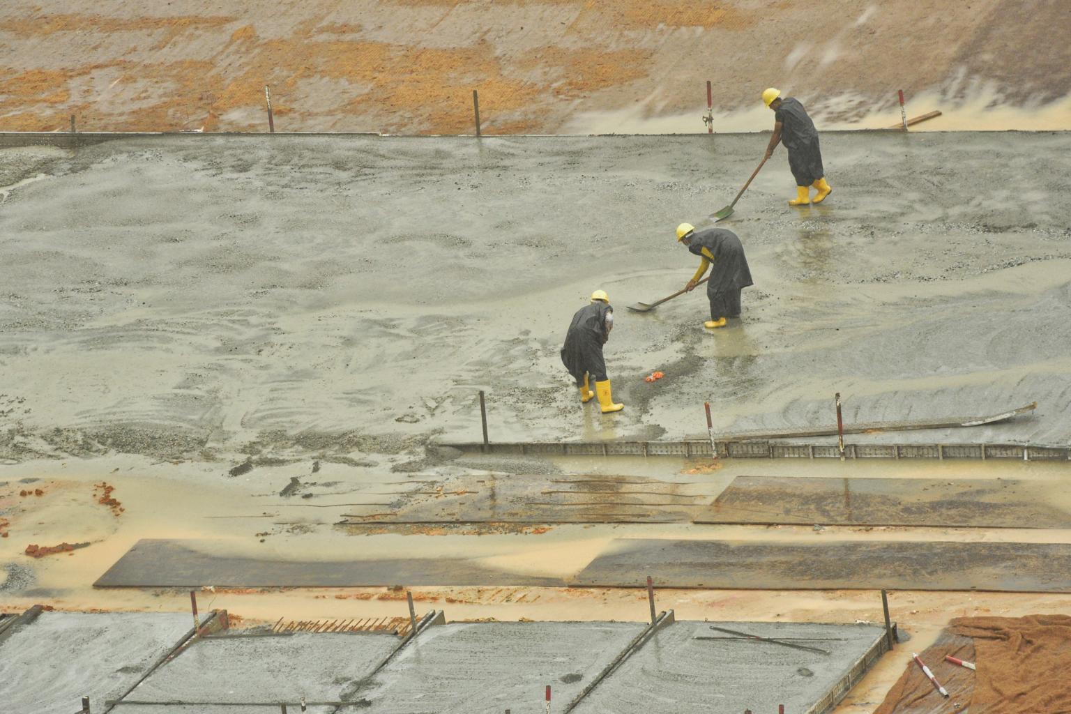 Migrant workers at work, amid heavy rain, at the Housing Board construction site of Dakota One.