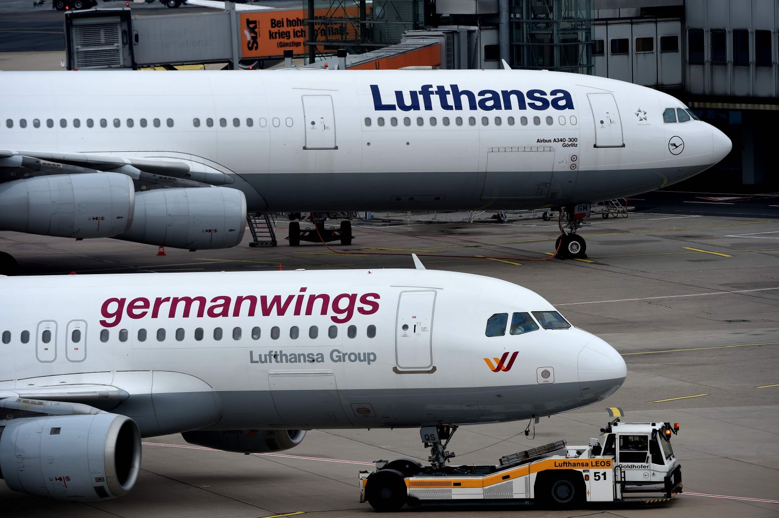 An Airbus plane of German airline Lufthansa (top) and a plane of the company's Germanwings subsidiary are pictured at Duesseldorf airport.