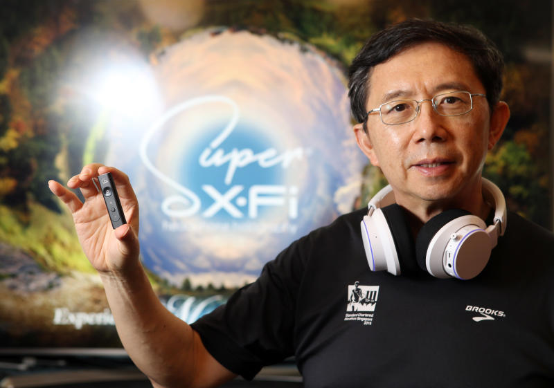 Sim Wong Hoo, founder and chief executive of Creative Technology, with a Super X-Fi amp headphone amplifier. Creative said rvenue contribution from Super X-Fi products for the current quarter is not expected to be significant to the overall revenue for the group.