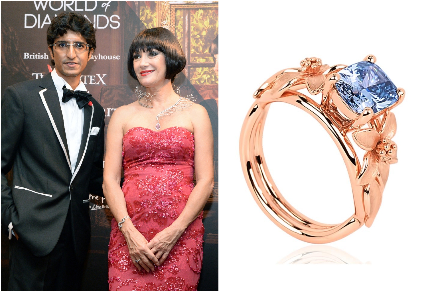 In a photo (left) taken on April 26, 2016, British-US actress Jane Seymour poses with Mr Karan Tilani, Director of World Of Diamonds Group, and the Jane Seymour diamond ring.