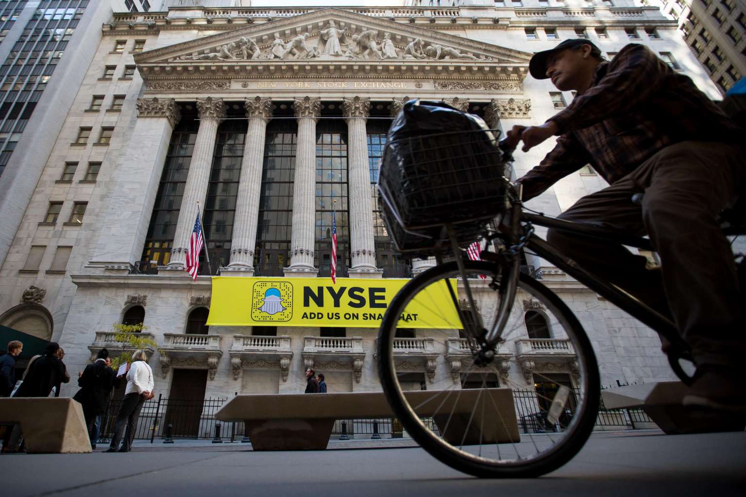 A man rides a bicycle past the New York Stock Exchange (NYSE) in New York, US, on Friday, Nov 4, 2016.