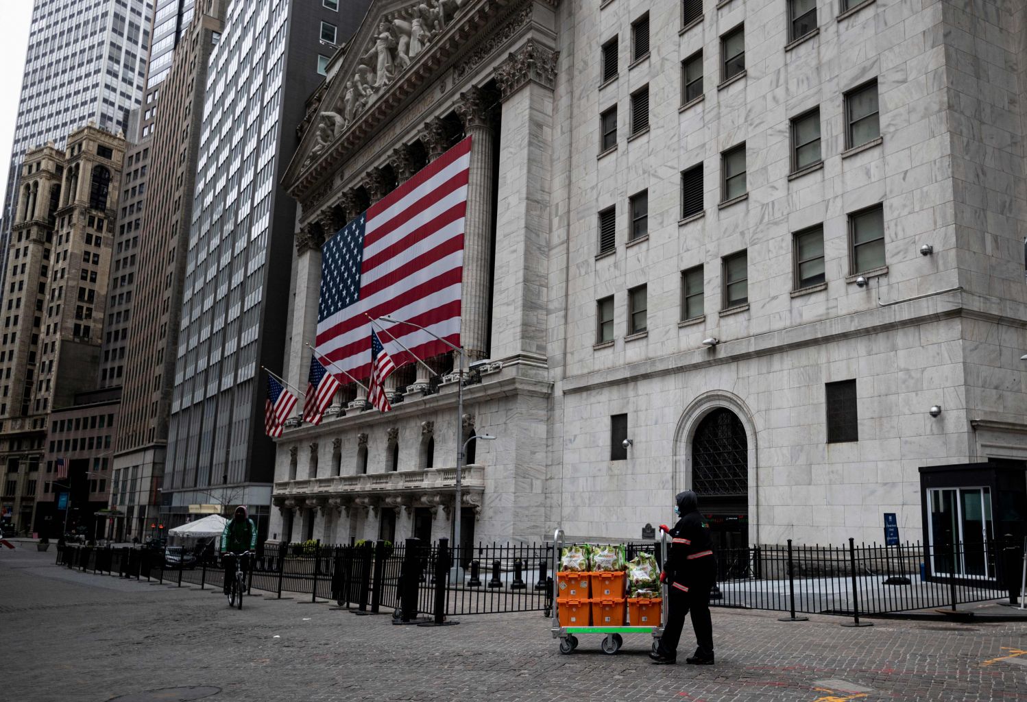A delivery worker passes the New York Stock Exchange on April 20, 2020.