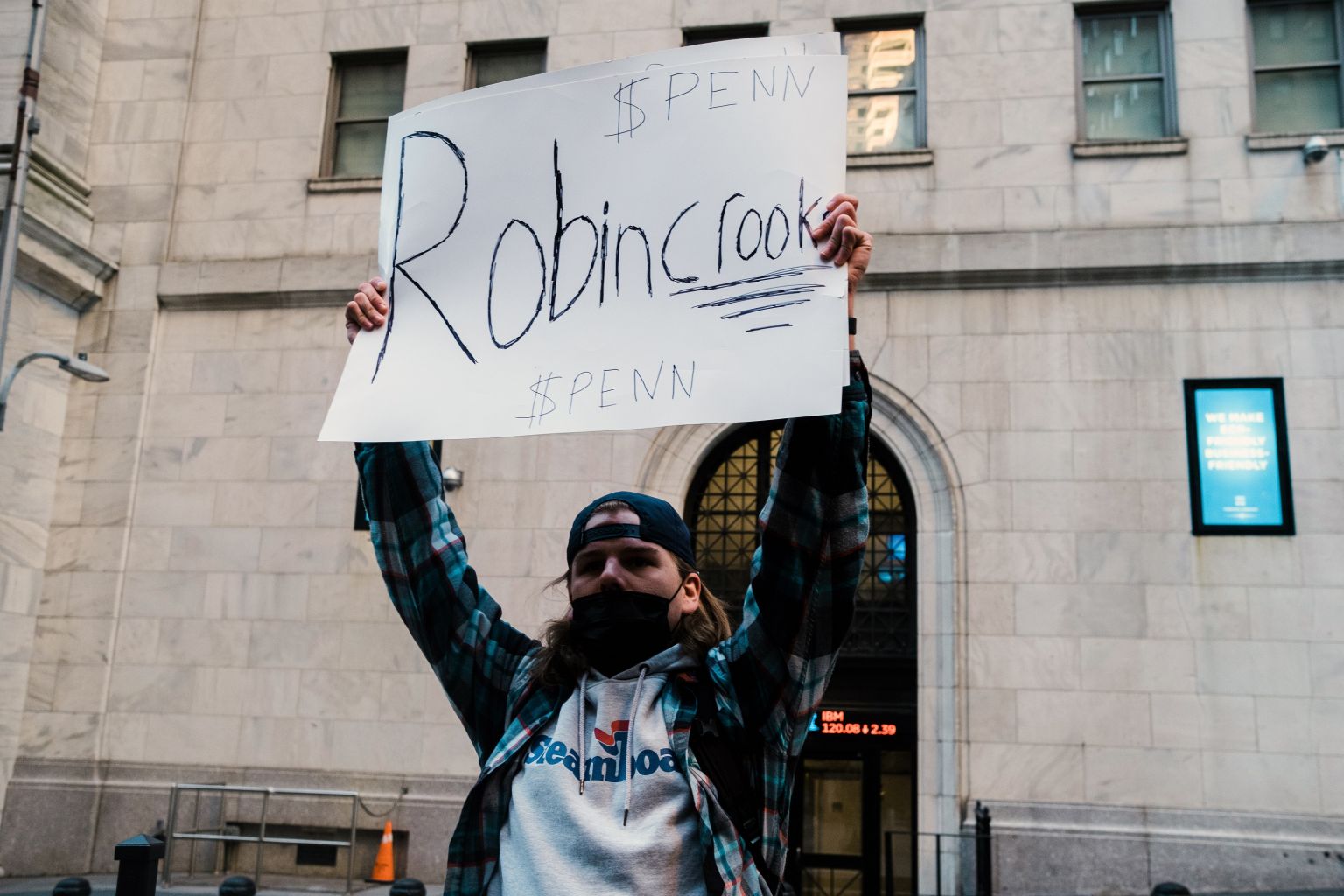 A protester holds a sign during a demonstration outside the New York Stock Exchange decrying Robinhood's decision to impose trading limits on GameStop and other stocks on Jan 28, 2021.
