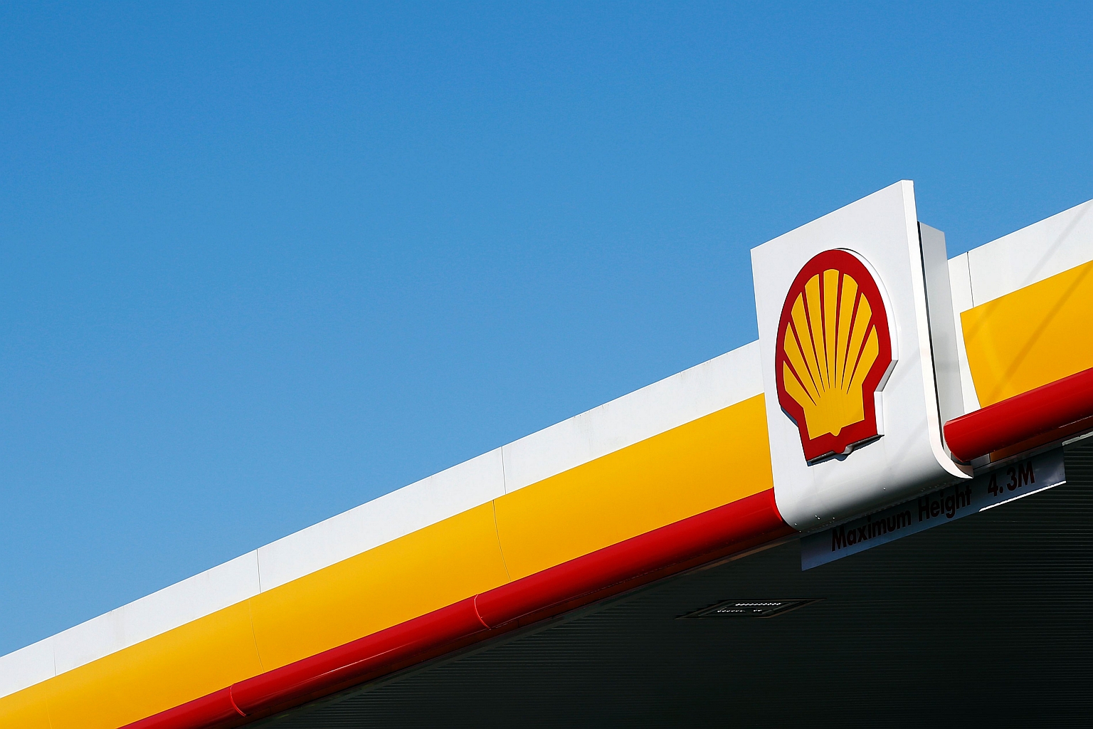 The Shell logo above the forecourt of a Royal Dutch Shell petrol station in Hook, England.