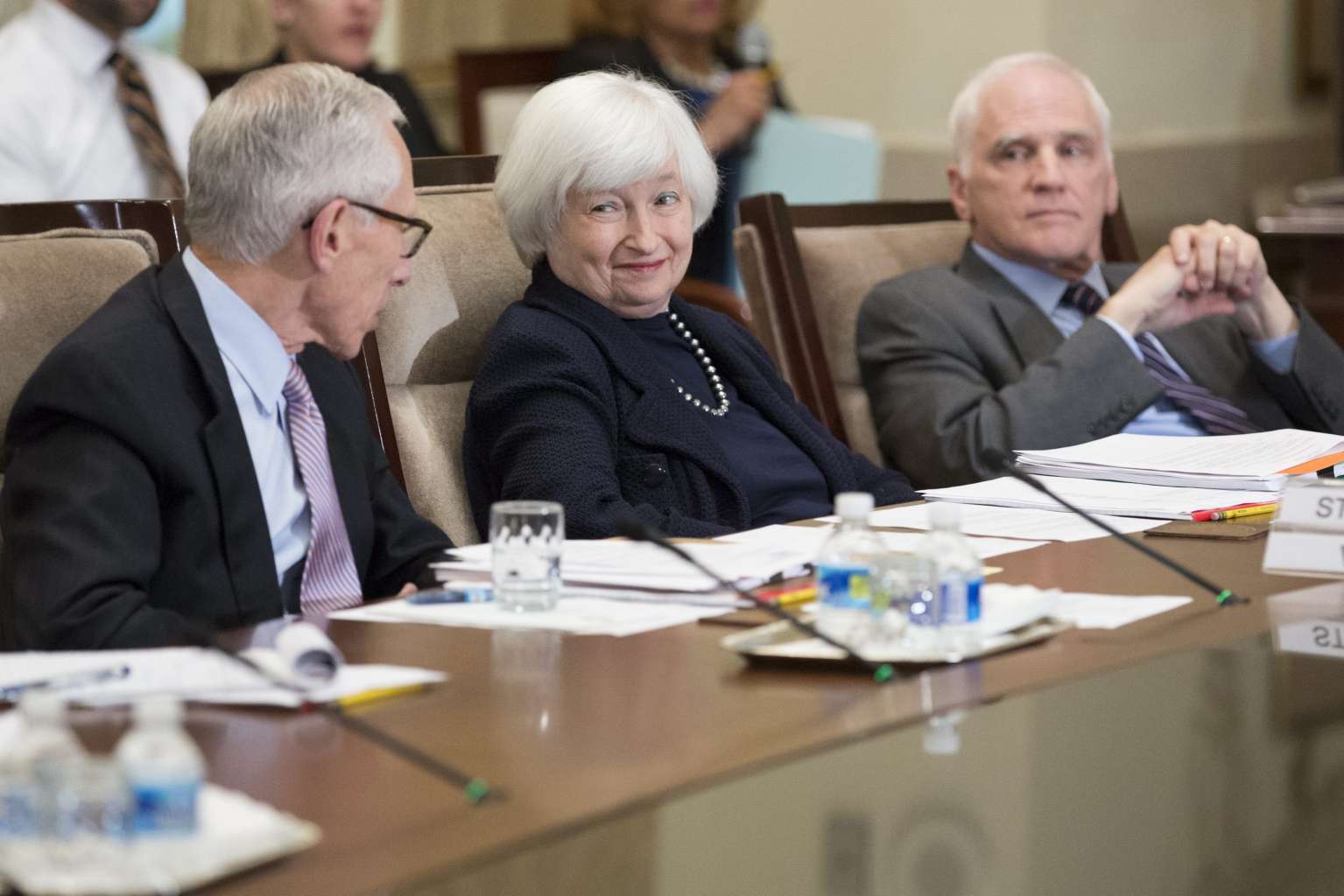 Fed chair Janet Yellen (centre) attends an open meeting of the Board of Governors of the Federal Reserve System.