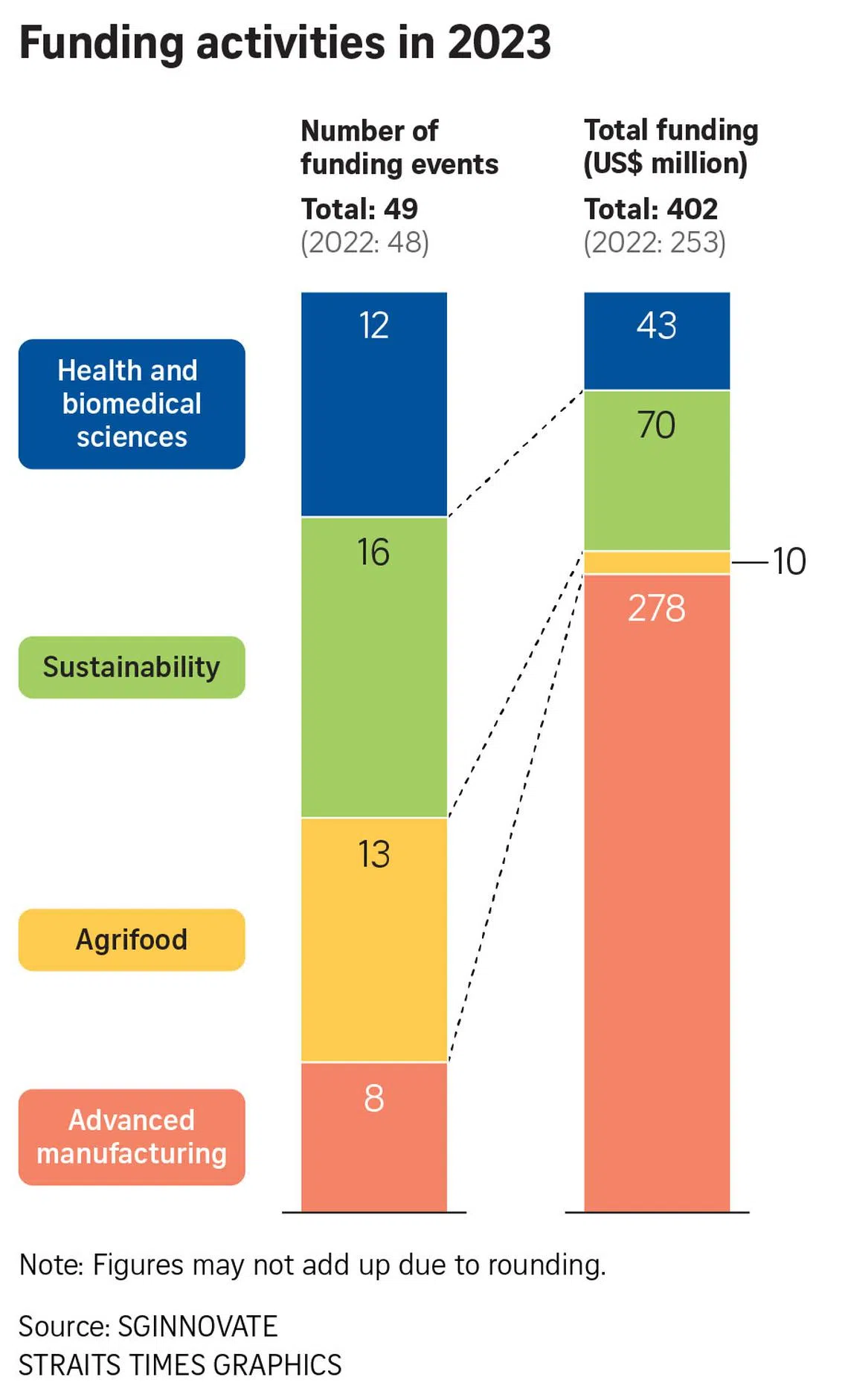 SINGAPORE - Singapore’s early-stage emerging technology start-ups raised US$402 million (S$548 million) in funding in 2023, up 59 per cent from the US$253 million raised in 2022, said national investment arm SGInnovate.
