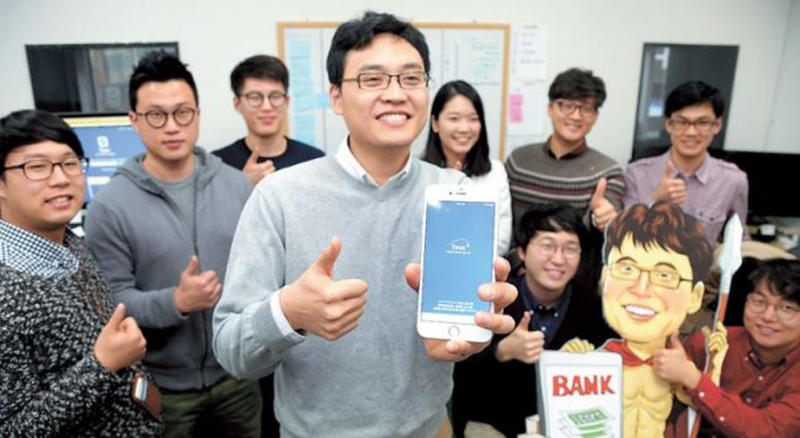 Viva Republica CEO and founder Lee Seung-gun (centre) poses with the company’s mobile money transfer app Toss in its office in Seoul.