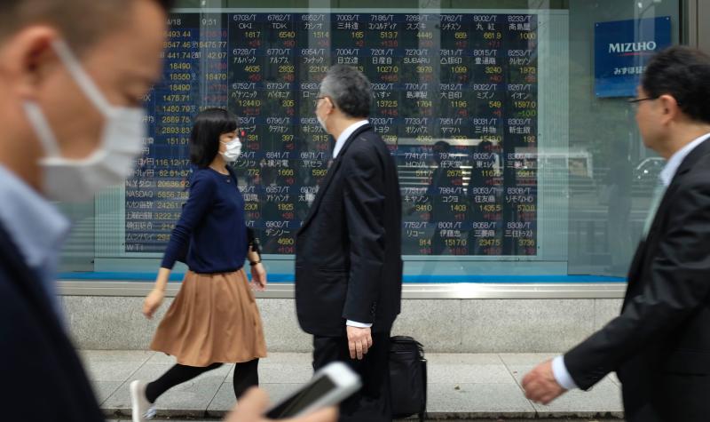 Pedestrians walk in front of a quotation board flashing the Nikkei key index of the Tokyo Stock Exchange.