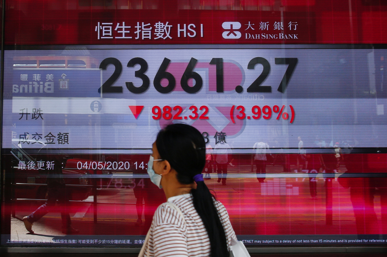 A panel displays the Hang Seng Index during afternoon trading, in Hong Kong on May 4, 2020.