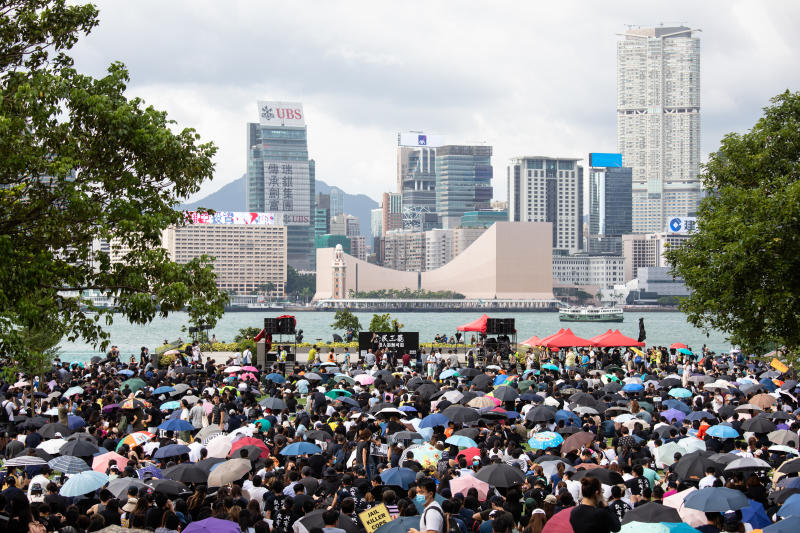 Demonstrators sit under umbrellas during a strike rally at Tamar Park in the Admiralty district of Hong Kong on Sept 3, 2019.
