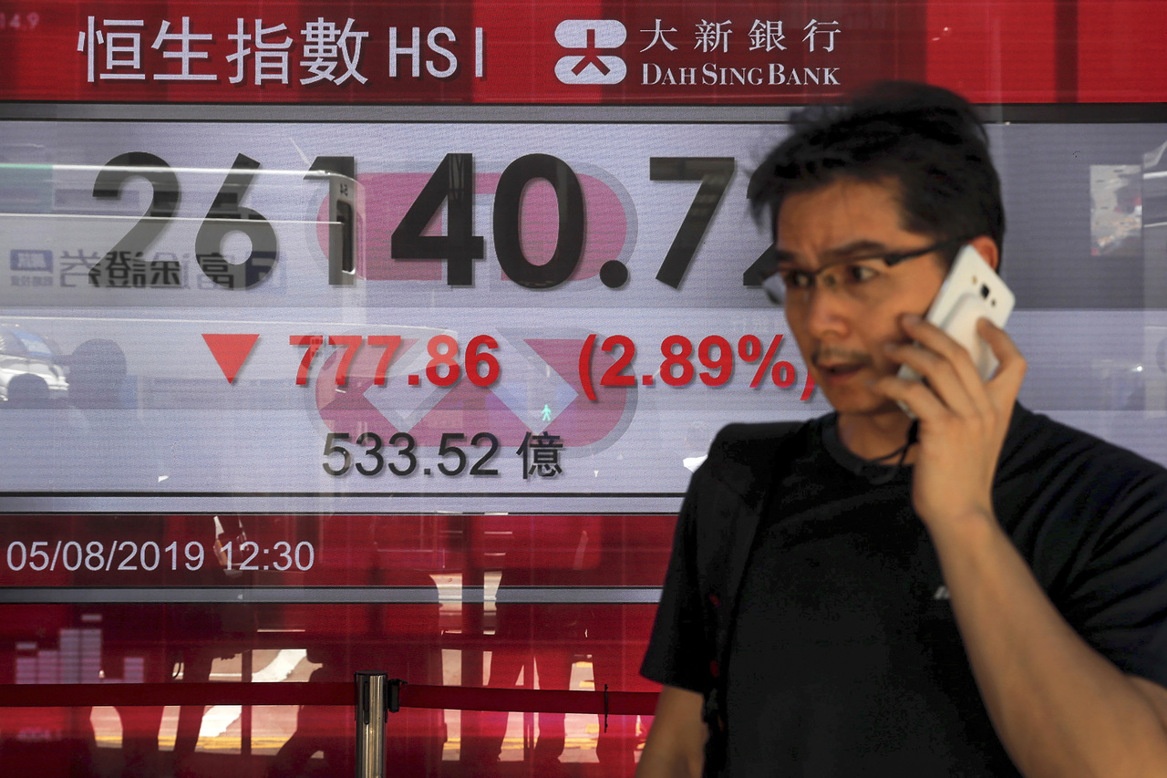 In the photo taken on Aug 5, 2019, a man using his smartphone walks by an electronic board showing the Hong Kong composite index outside a bank in Hong Kong.