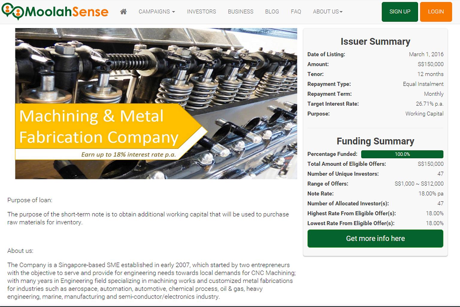 The company, which does machining and metal fabrication, needed the loan to buy raw materials for inventory, MoolahSense said in a press release on Thursday (March 3).