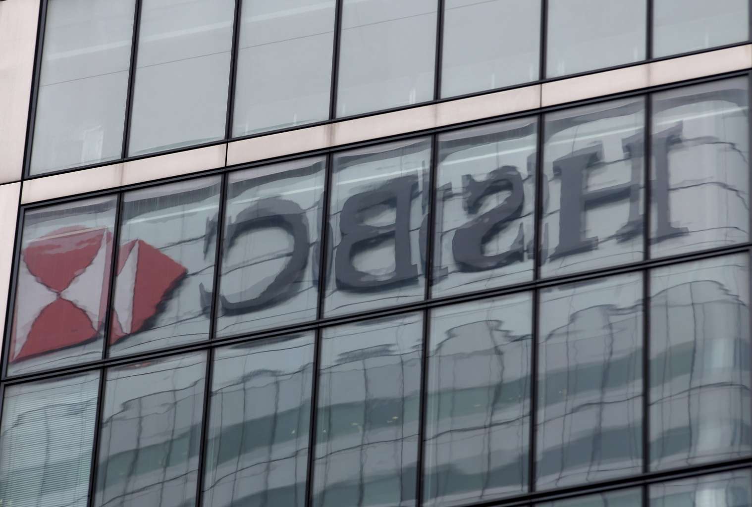 The HSBC headquarters is seen reflected in a neighbouring building in the Canary Wharf financial district in east London.