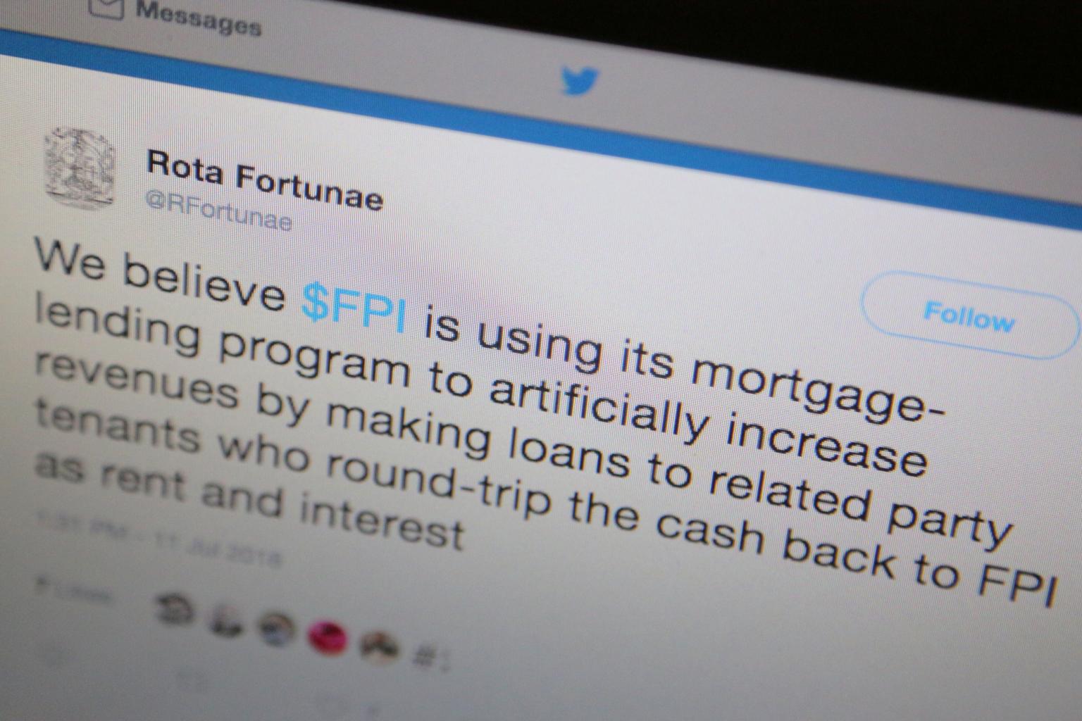 A tweet from the account of Rota Fortunae regarding Farmland Partners.