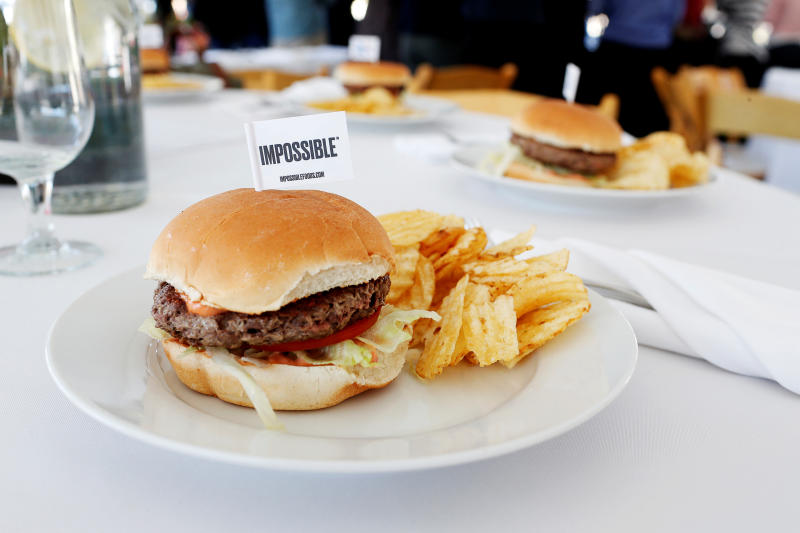 In a file photo taken on Oct 6, 2016, the completed plant-based hamburger is displayed during a media tour of Impossible Foods labs and processing plant in Redwood City, California.