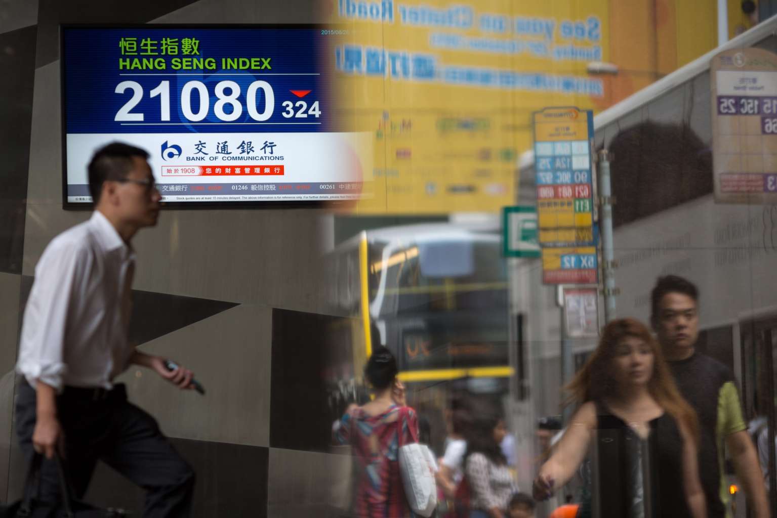 A pedestrian walks past an electric board displaying Hong Kong's Hang Seng Index figures in Hong Kong, China on Aug 26, 2015.