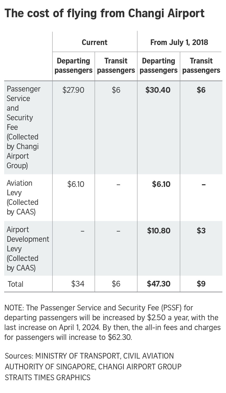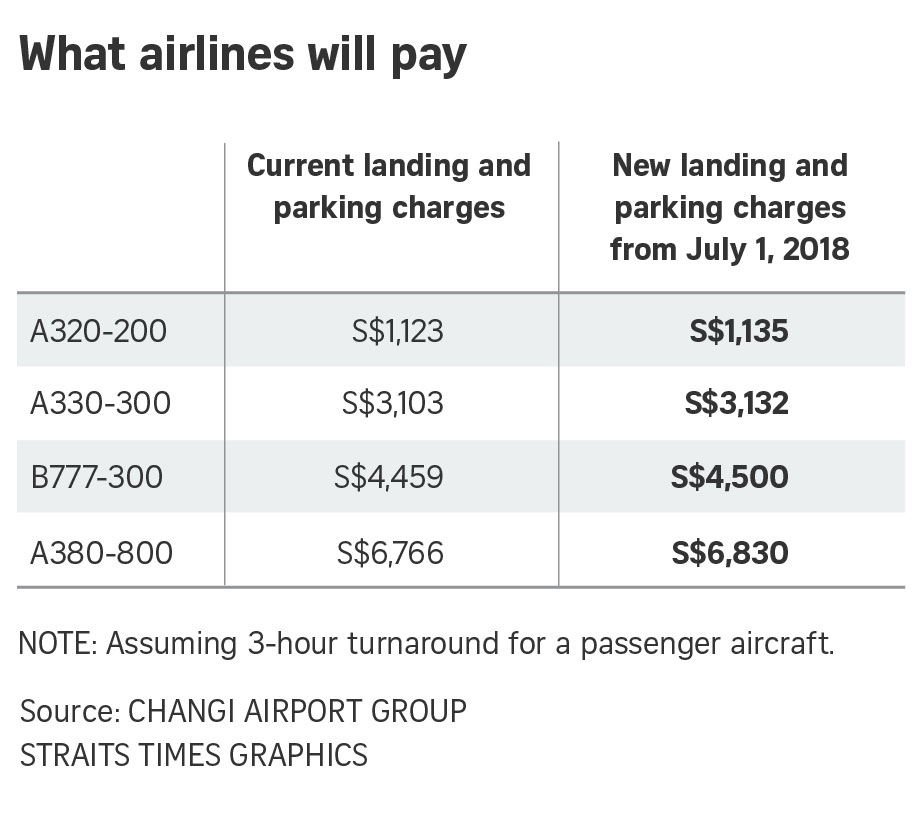 Changi Airport is also raising its passenger service and security fee, currently at S$27.90, by S$2.50 from July 2018. The fees will also be increased by S$2.50 annually over the next six years from April 2019. The measures are to help fund the city-state's airport expansion plans, which include a fifth terminal that is to be completed around 2030.