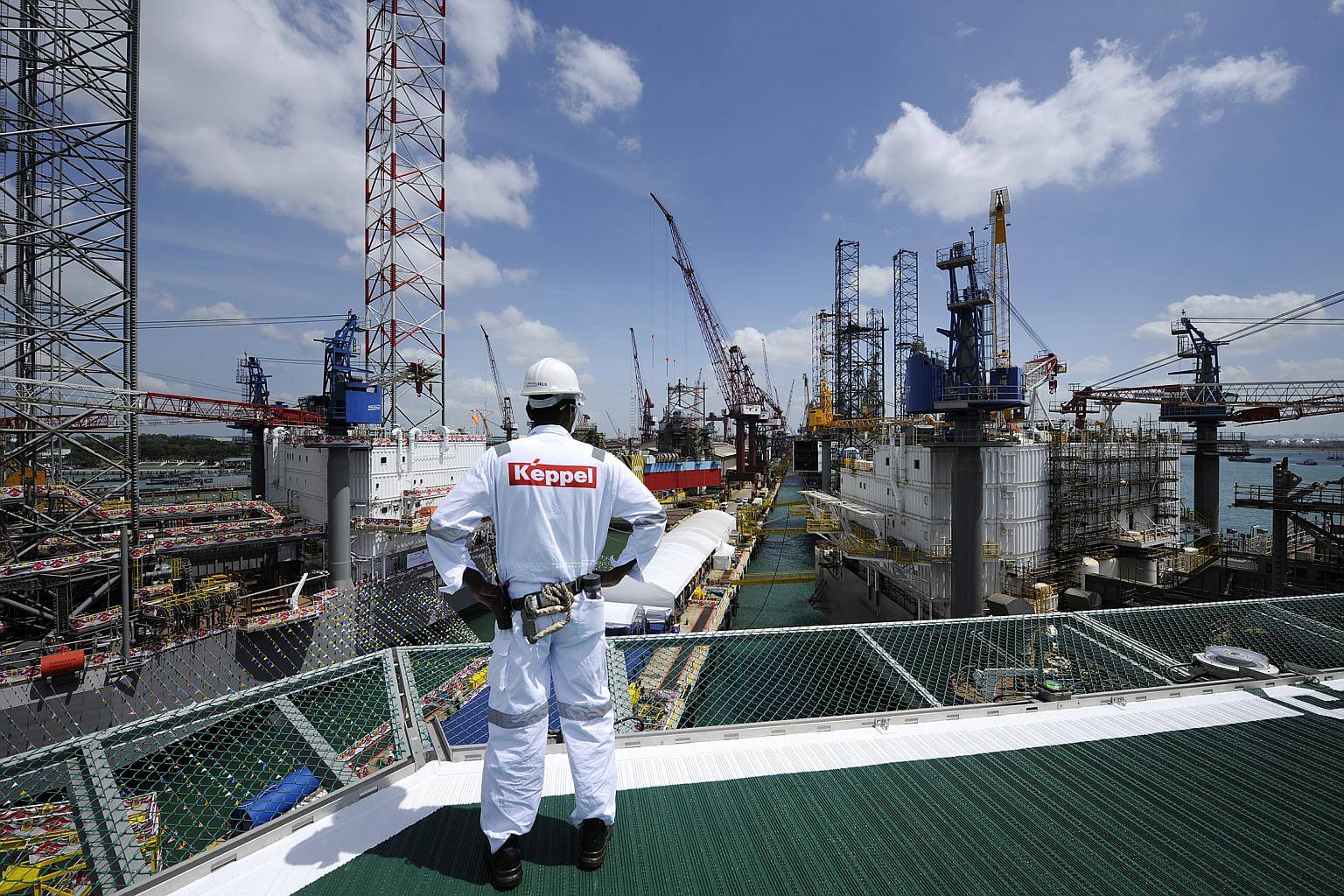 A Keppel Corporation employee looks out towards rigs that are under construction.