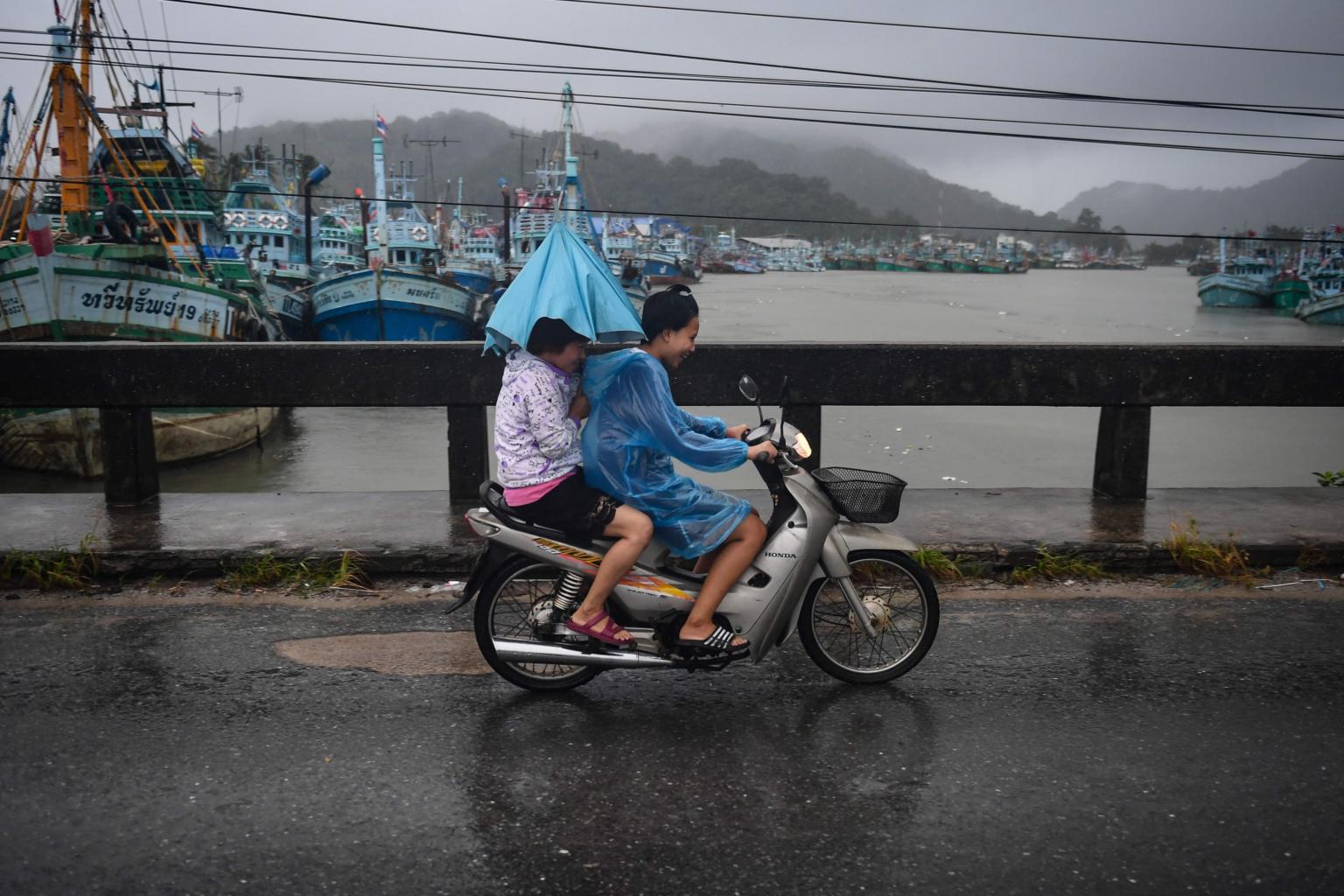 Two girls riding through heavy rain due to Tropical Storm Pabuk in the southern Thai province of Nakhon Si Thammarat, on Jan 4, 2019.