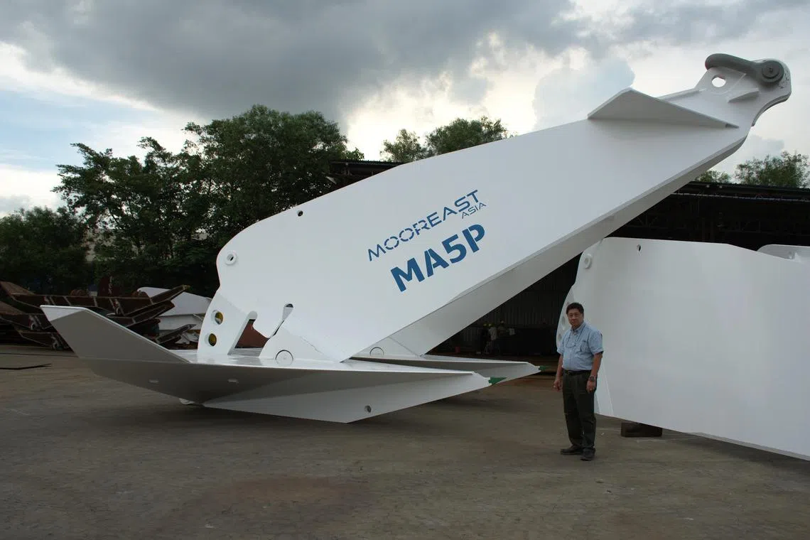 Mooreast executive director Sim Koon Lam with the company’s proprietary drag anchor design, which is a type of subsea foundation that can be used to hold floating infrastructure like offshore wind platforms.