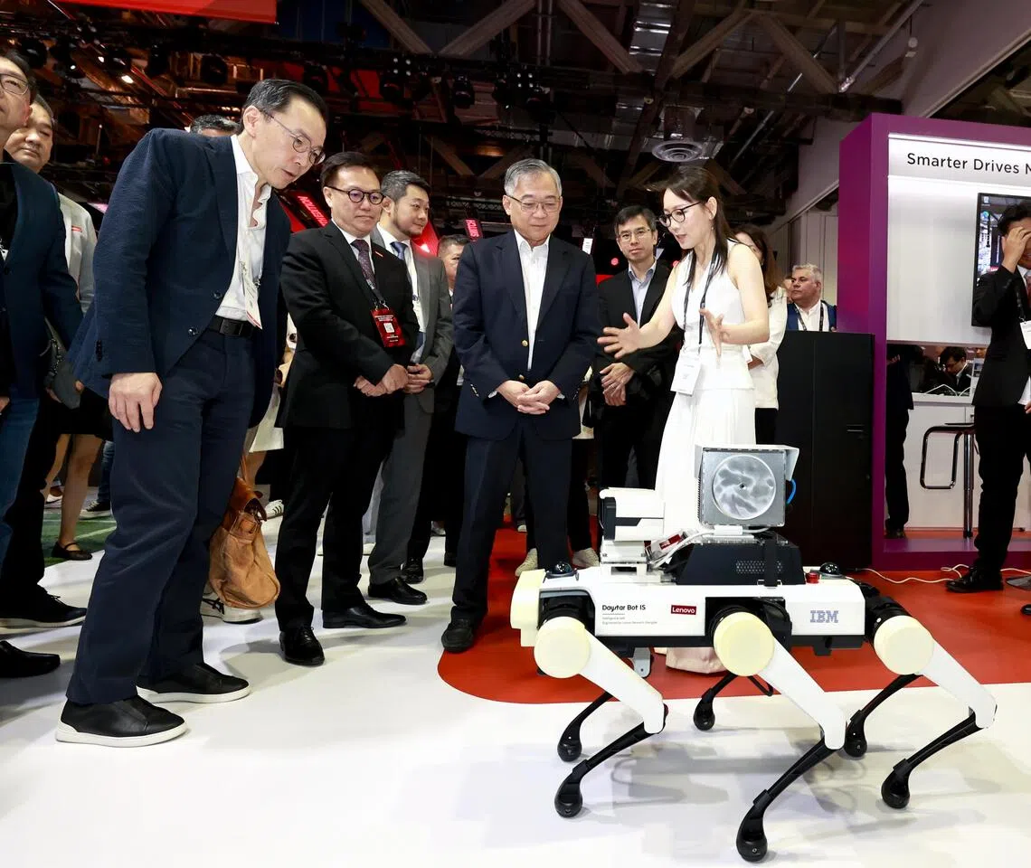 Deputy Prime Minister Gan Kim Yong viewing a demonstration of a robot at the Lenovo booth at the Singapore Week of Innovation and Technology 2025 on Oct 29.