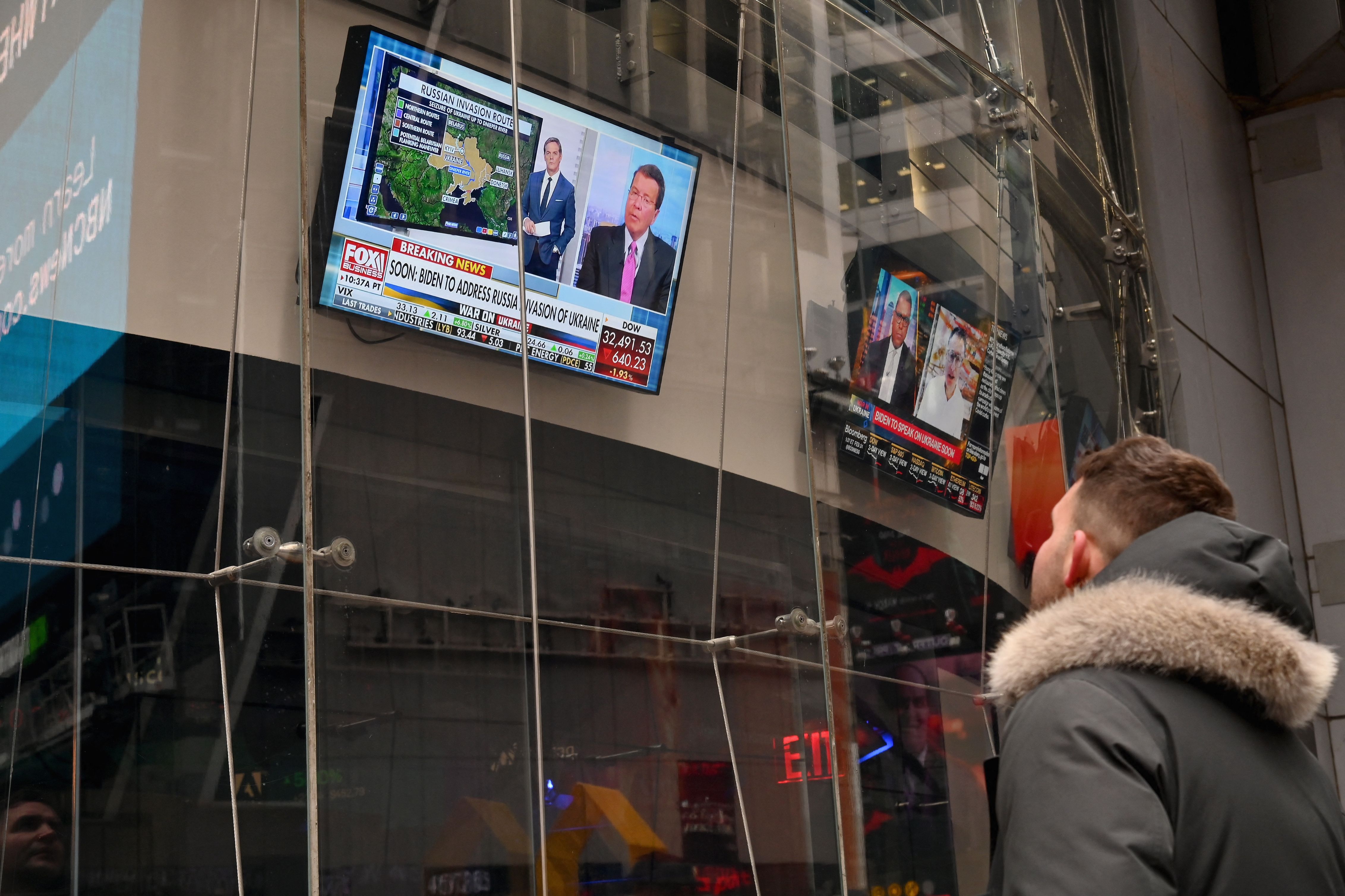 A man watches a news broadcast on Russia's invasion of Ukraine, in Times Square, New York, on Feb 24, 2022.