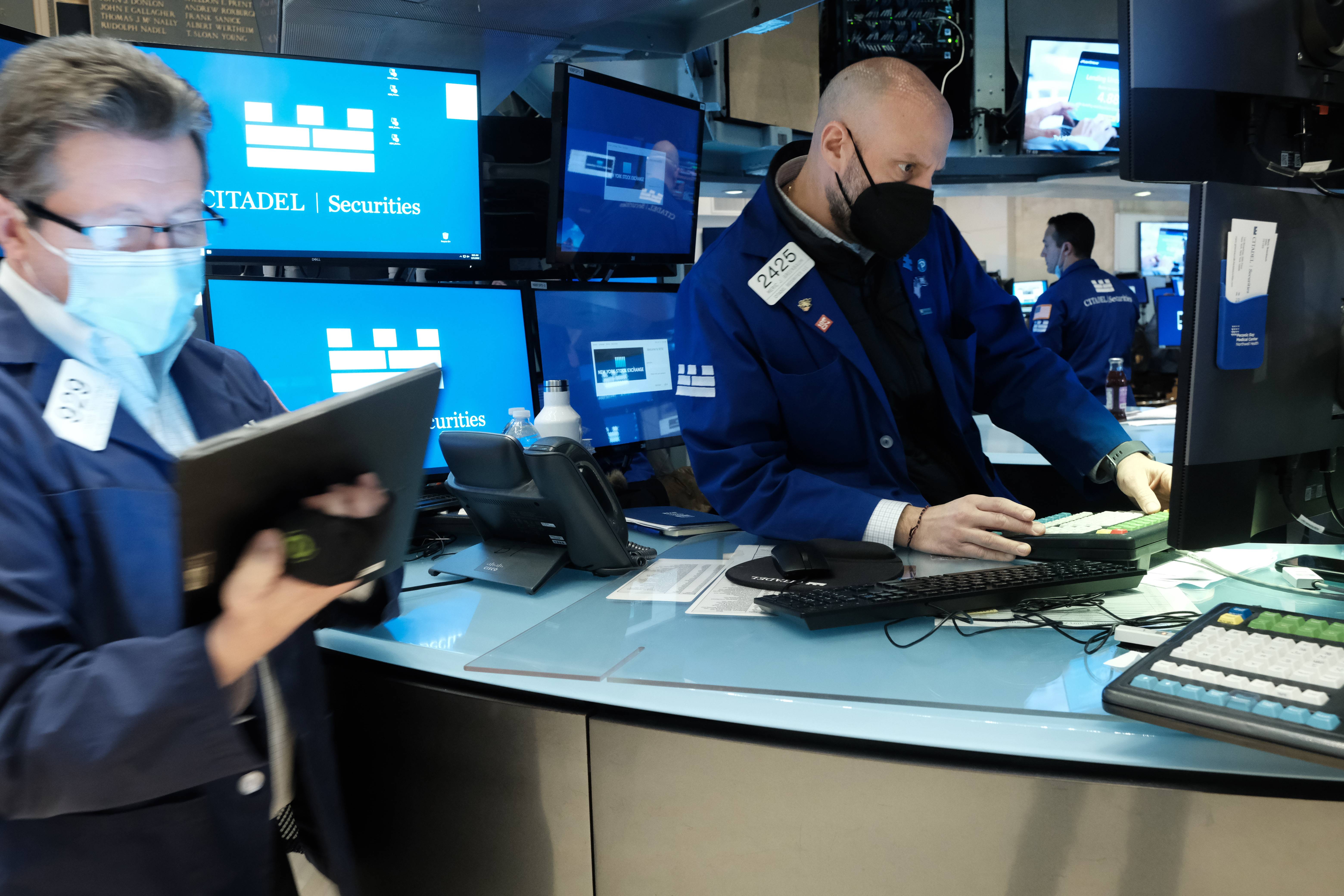 Traders work on the floor of the New York Stock Exchange in New York City.