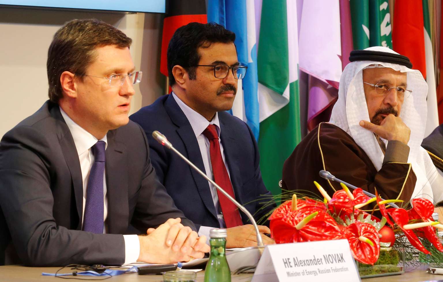 Russia's Energy Minister Alexander Novak, Opec president and Qatar's Energy Minister Mohammed al-Sada and Saudi Arabia's Energy Minister Khalid al-Falih address a news conference on Dec 10, 2016.