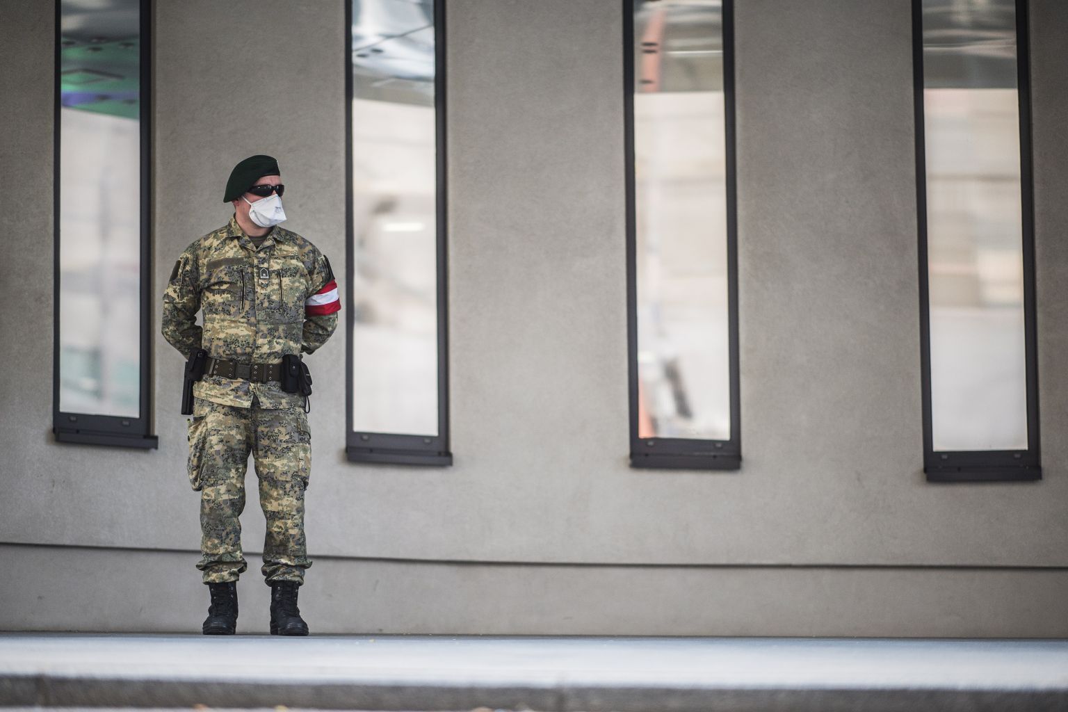 A soldier wearing a protective face mask patrols at the Opec headquarters in Vienna, Austria, April 9, 2020.