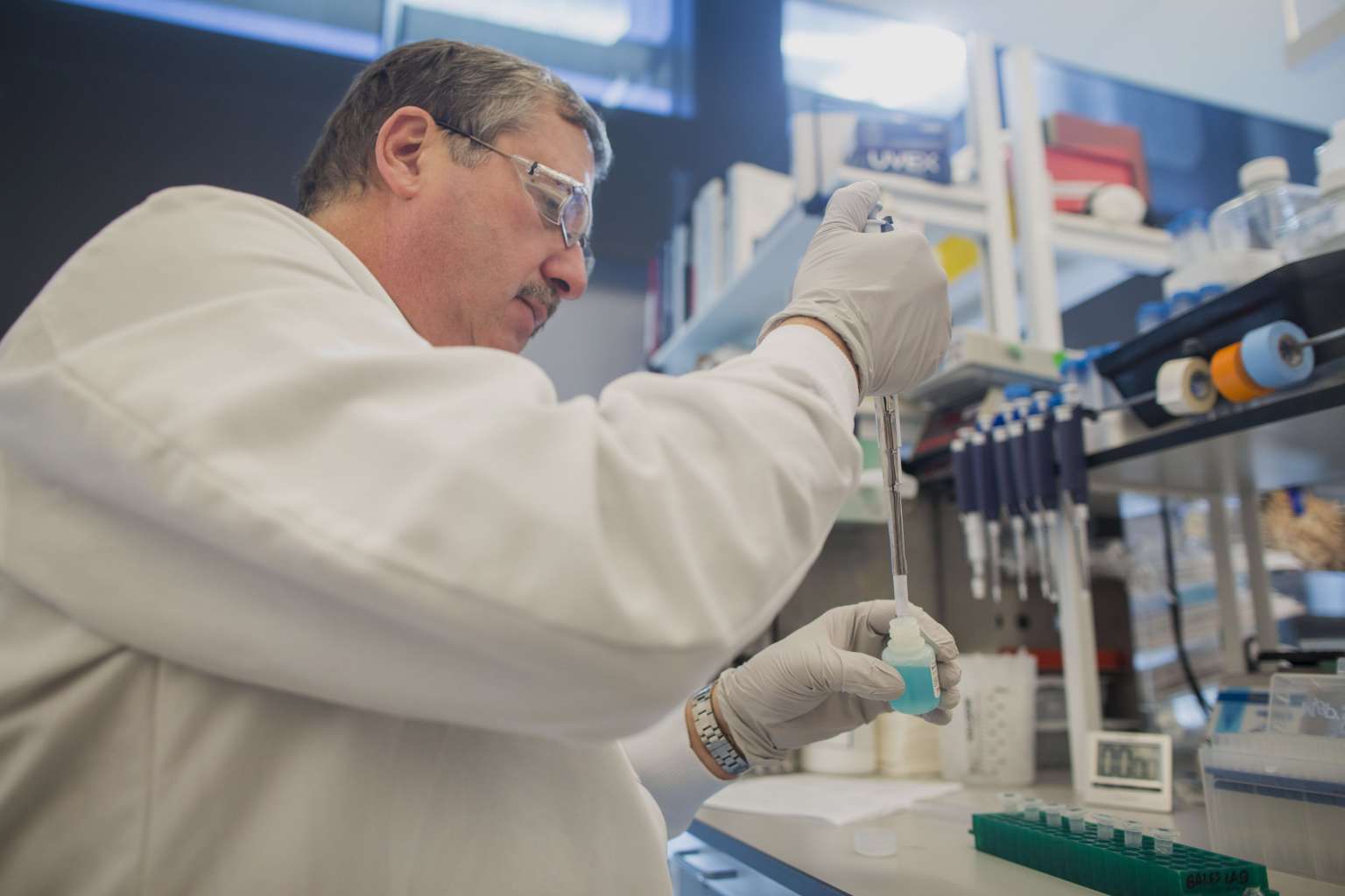 A worker testing chemicals in a laboratory at the Pfizer research and development facility in Cambridge, Massachusetts.
