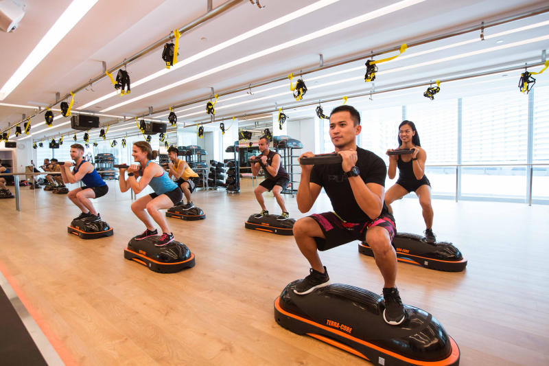 A fitness class at a Pure Fitness gym at Ocean Financial Centre in Raffles Place.