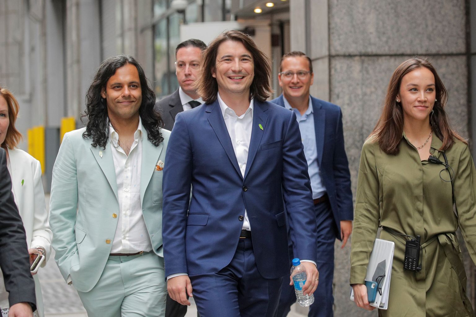 Robinhood Markets co-founders Vlad Tenev (centre right) and Baiju Bhatt (centre left) attend their company’s IPO at the Nasdaq Market site in New York City, on July 29, 2021.