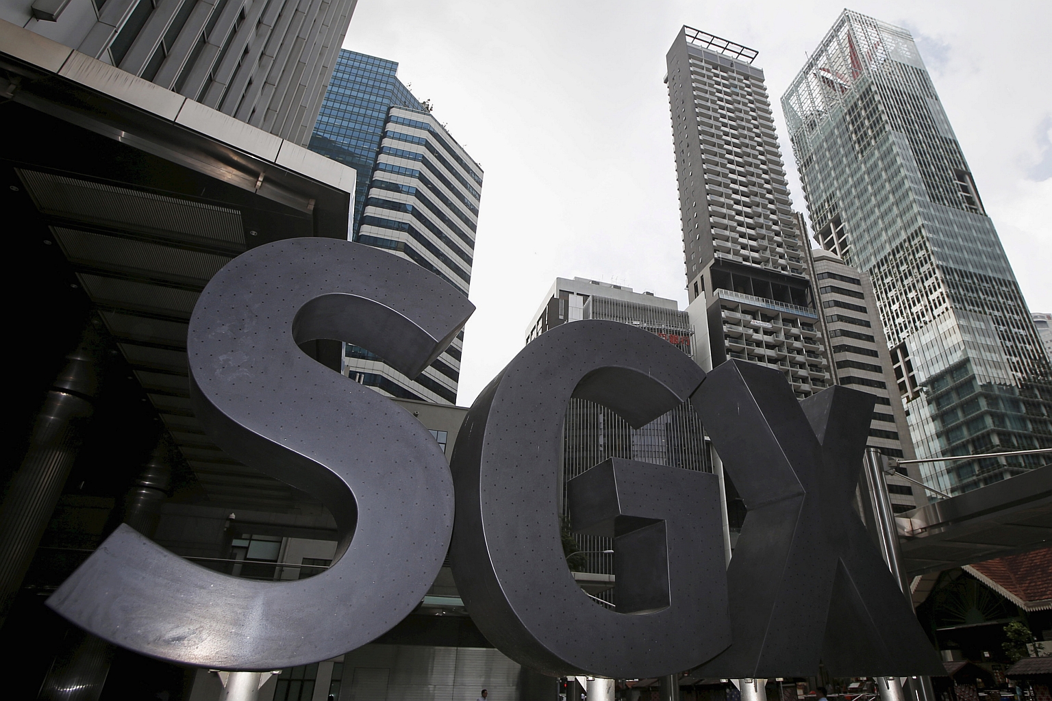 A Singapore Exchange (SGX) sign sits outside its premises in the Central Business District of Singapore.