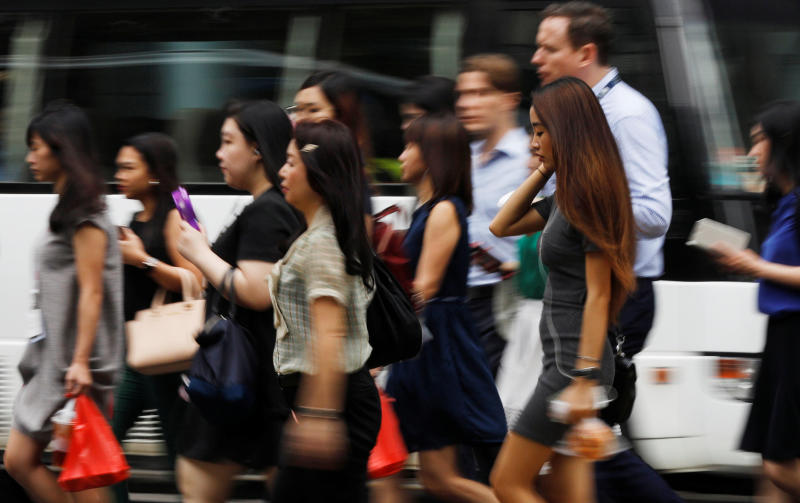 Office workers cross a street in Singapore's central business district on April 27.