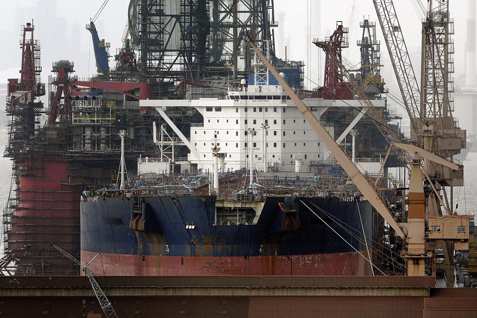 An oil tanker in the foreground and an oil rig in the back undergo repair at the Jurong Shipyard of Sembcorp Marine Ltd. in Singapore.