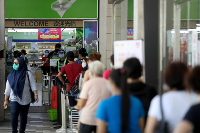 Shoppers queueing to enter a Sheng Siong supermarket in Bedok on April 22, 2020.