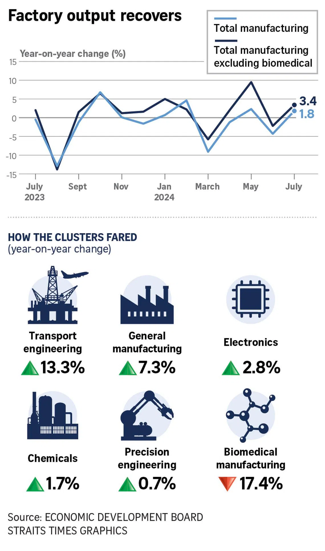 Factory output expanded by 1.8 per cent in July year on year, with all but the biomedical industry recording growth, said the Economic Development Board (EDB).