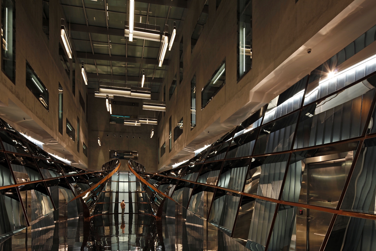 The low, flat building was designed by Swiss architects Benedicte Montant and Carmelo Stendardo and includes energy-saving features such as thermal insulation and vegetation-covered walls to help maintain the precise temperatures and humidity levels inside. A 38m-long sculpture of polished steel by Israeli artist Ron Arad greets visitors at the lobby once they have passed security checks and a body scan.
