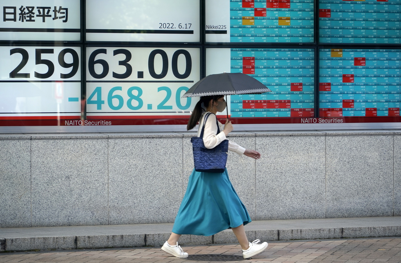 A woman walks past a stock market indicator board in Tokyo on June 17. Japanese shares slid about 5 per cent.