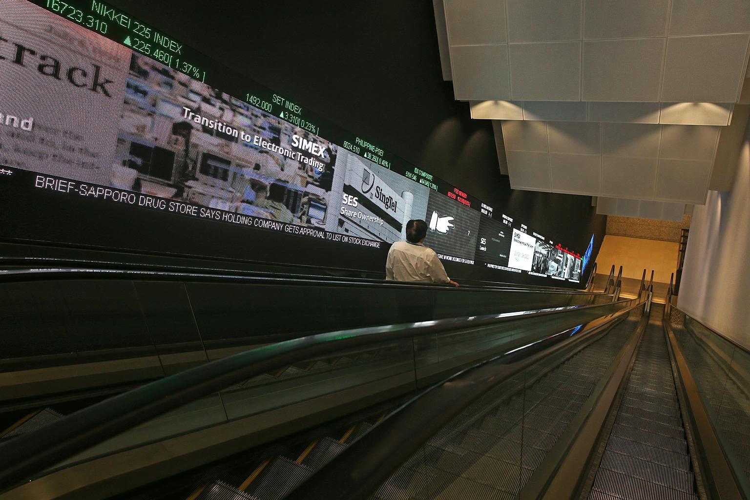 A man taking the escalotor down at the SGX Centre.