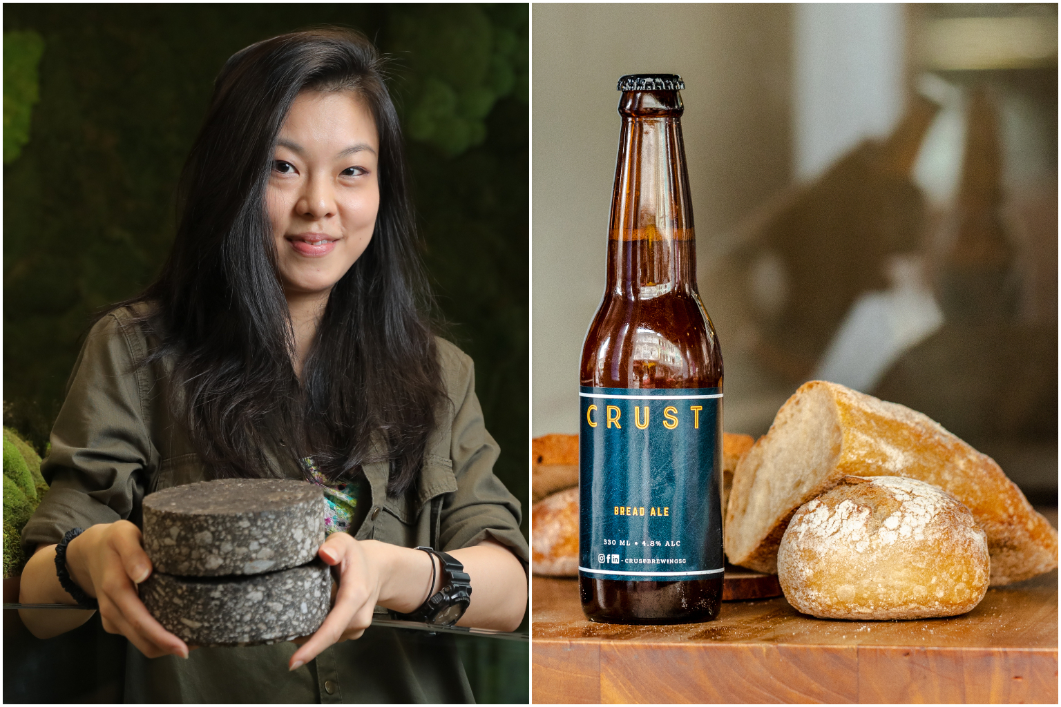 Magorium founder Oh Chu Xian with the start-up's road construction material prototypes and a beverage by Crust Group, which transforms food waste into drinks.
