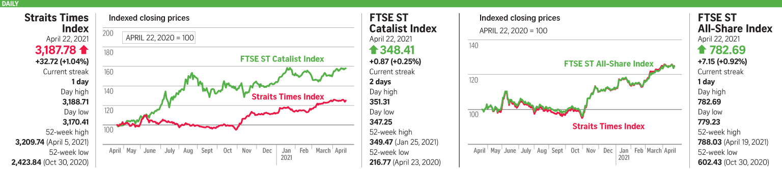 Investors' breezier mood sent the benchmark Straits Times Index (STI) up 1.04 per cent or 32.72 points to 3,187.78, with gainers outpacing losers 273 to 203 on trade of 1.41 billion shares worth $1.24 billion. The STI's top performer was ComfortDelGro, which was up 2.29 per cent at $1.79. E-commerce platform Lazada and ComfortDelGro have announced a partnership that allows shoppers to book ComfortDelGro taxis using the Lazada app.