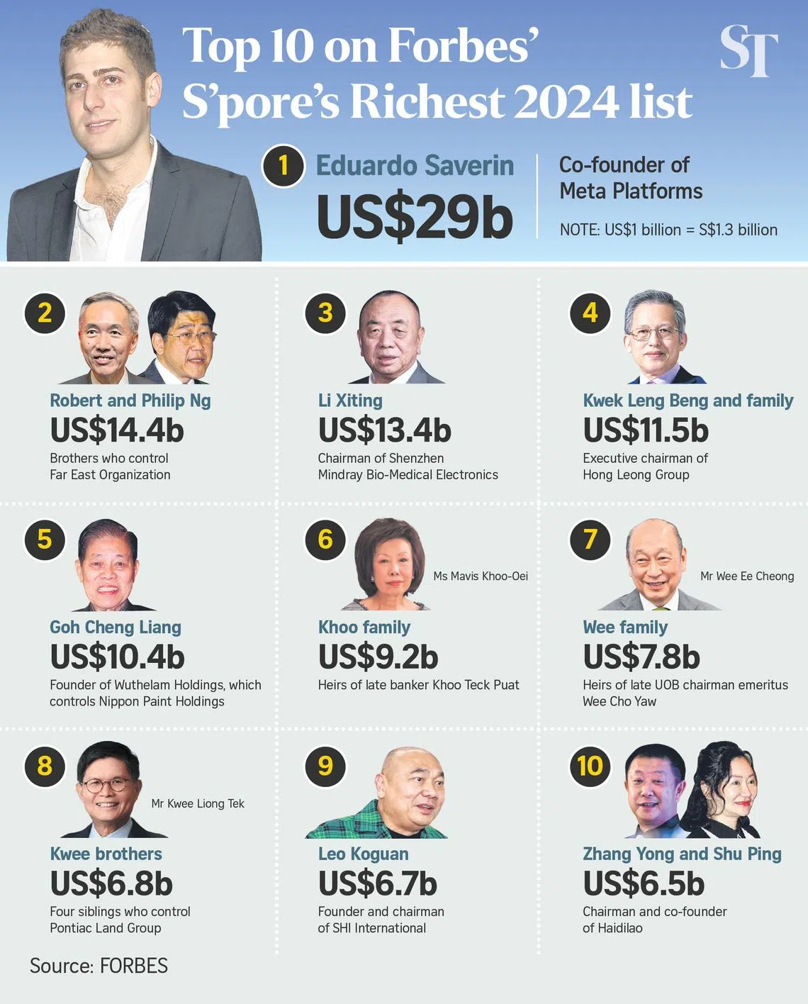 Singapore tycoons’ wealth rises 10%, with Eduardo Saverin topping Forbes’ rich list again