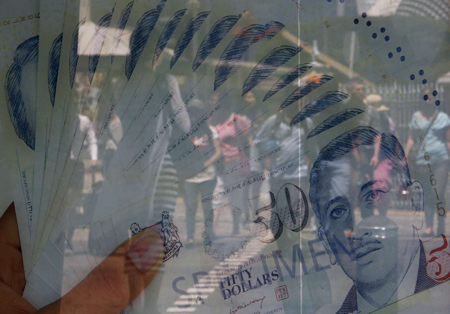 Reflection of people seen on a poster of 50 Singapore dollar bills.