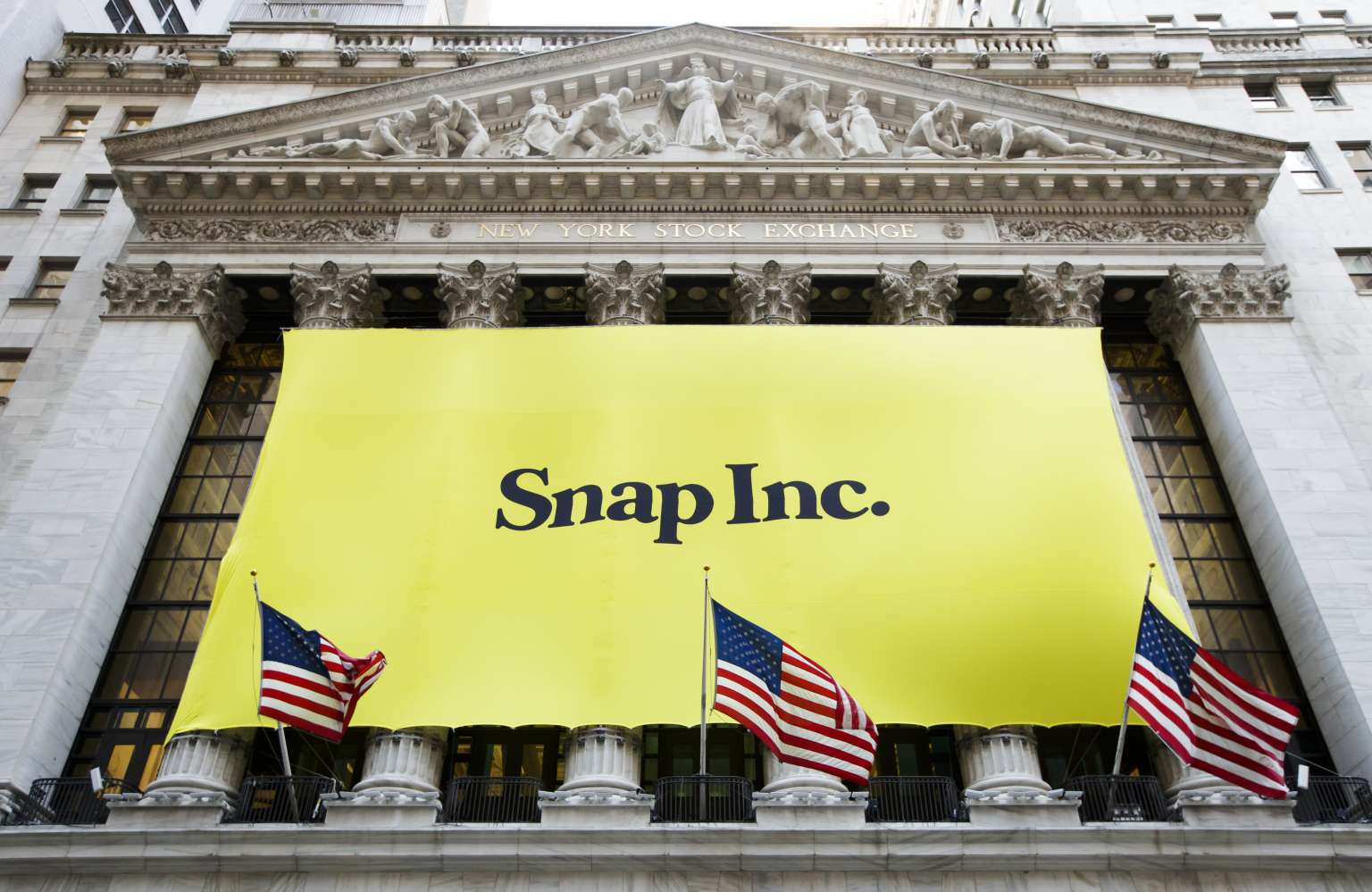 Signage hangs on the front of the New York Stock Exchange before the initial public offering of Snap Inc, the parent company of Snapchat.