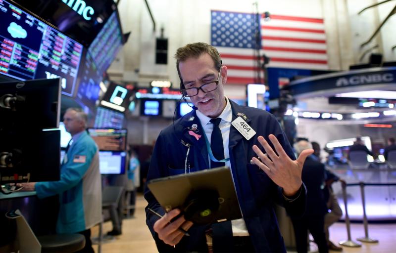 Traders work during the closing bell at the New York Stock Exchange on Wall Street.